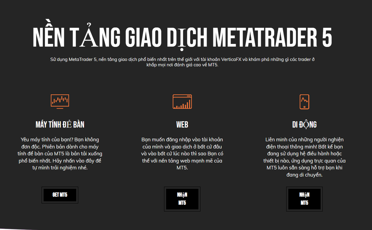 - Nền tảng giao dịch mạnh mẽ MT5, tương thích trên mọi thiết bị.