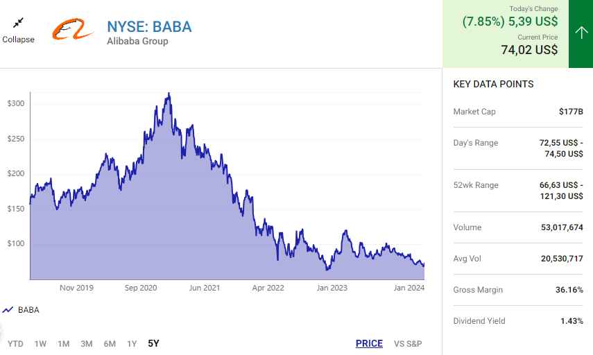 Giá cổ phiếu Alibaba hiện đã giảm 79% so với mức đỉnh vài năm trước. Mặc dù môi trường pháp lý của Trung Quốc từng là một yếu tố gây ra sự bất ổn cho các nhà đầu tư, nhưng vấn đề lớn nhất ảnh hưởng đến giá của cổ phiếu chính là nền kinh tế trì trệ. Alibaba không còn tăng trưởng nhanh như trước đại dịch COVID-19. Đây là nguyên nhân chính khiến giá cổ phiếu sụt giảm, đặc biệt khi cổ phiếu Alibaba được định giá ở mức quá cao.