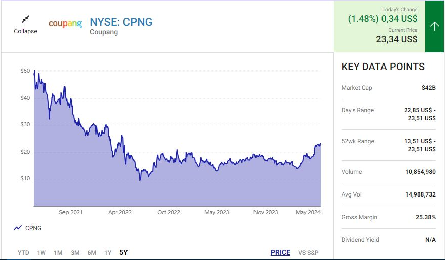 Đây sẽ là tín hiệu tốt cho các cổ phiếu thương mại điện tử khác, bao gồm cả Coupang, một công ty của Hàn Quốc, được ví như phiên bản Amazon của xứ sở kim chi. Hiện tại có thể là thời điểm lý tưởng để mua cổ phiếu này vì nó đã giảm 67% so với mức đỉnh sau đợt IPO vào năm 2021.