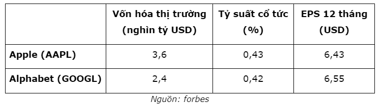 Bảng dưới đây đưa ra so sánh về vốn hóa thị trường, tỷ lệ cổ tức, và EPS (lãi trên mỗi cổ phiếu) trong 12 tháng trước (TTM) giữa cổ phiếu của Apple và Google (Alphabet).