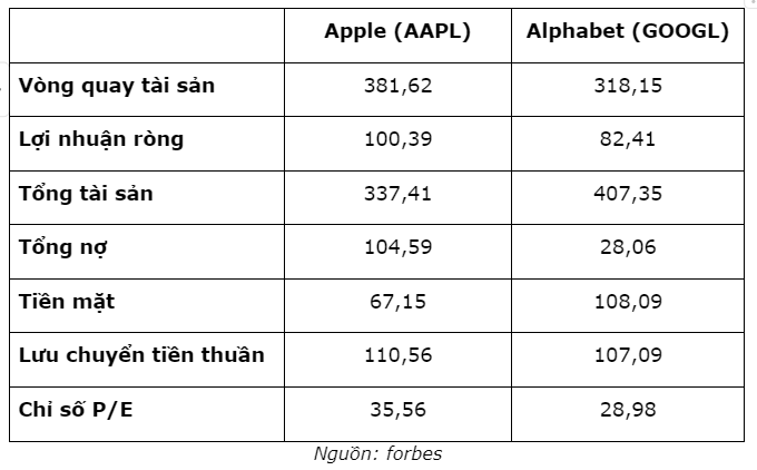 Bảng dưới đây cung cấp một cái nhìn tổng quan về báo cáo thu nhập, bảng cân đối kế toán, dòng tiền và các chỉ số định giá giữa Apple và Alphabet.