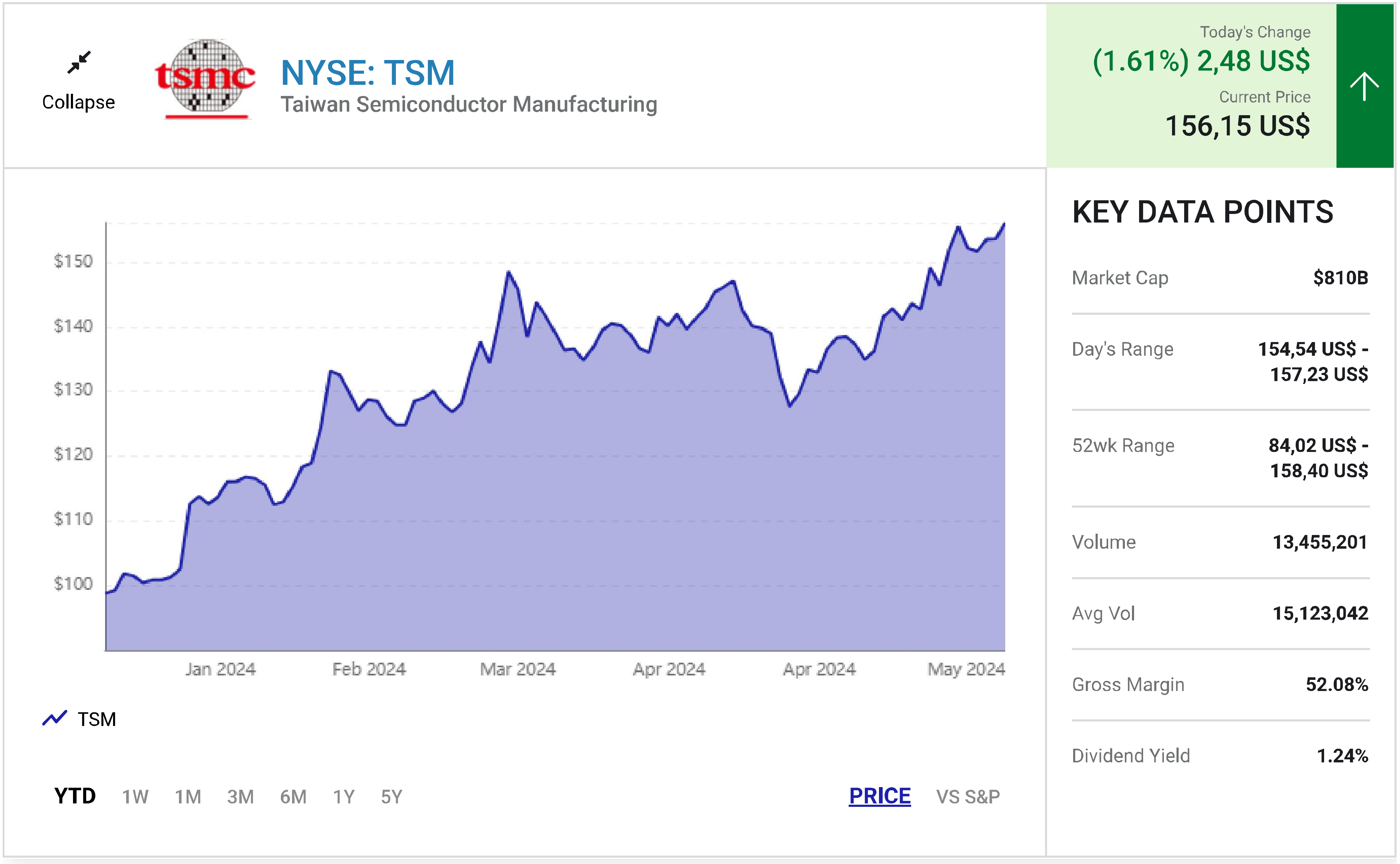 Mua cổ phiếu của TSMC có nghĩa là bạn không cần quan tâm đến chip của công ty nào thống trị miễn là TSMC sản xuất ra chúng. Hình thức sản xuất chip theo hợp đồng này có thể được xem là một cách tiếp cận khôn ngoan của TSMC trong cuộc đua AI có thể kéo dài trong nhiều năm.