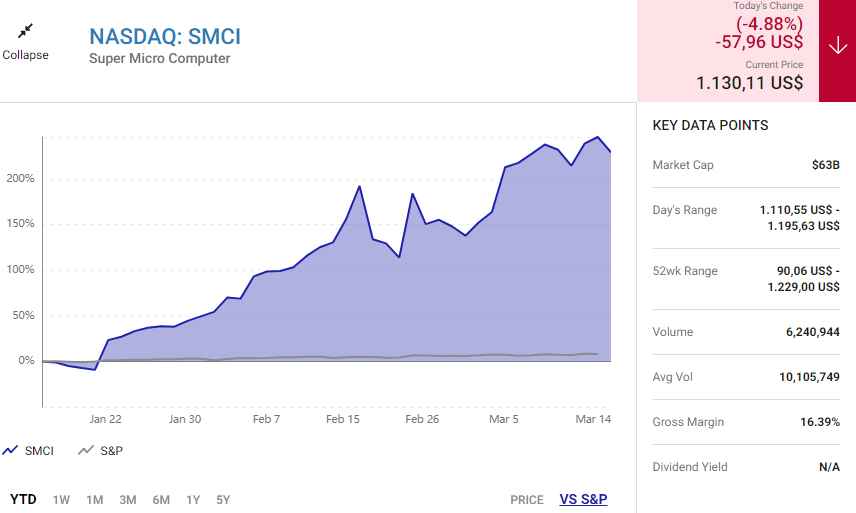 Là cổ phiếu hot nhất ở Phố Wall ở thời điểm hiện tại, Super Micro Computer (SMCI) đã tăng giá đáng kinh ngạc 1.060% trong 12 tháng qua – nghĩa là khoản đầu tư 1.000 USD vào tháng 3 năm ngoái sẽ tăng lên gần 12.000 USD hiện nay.