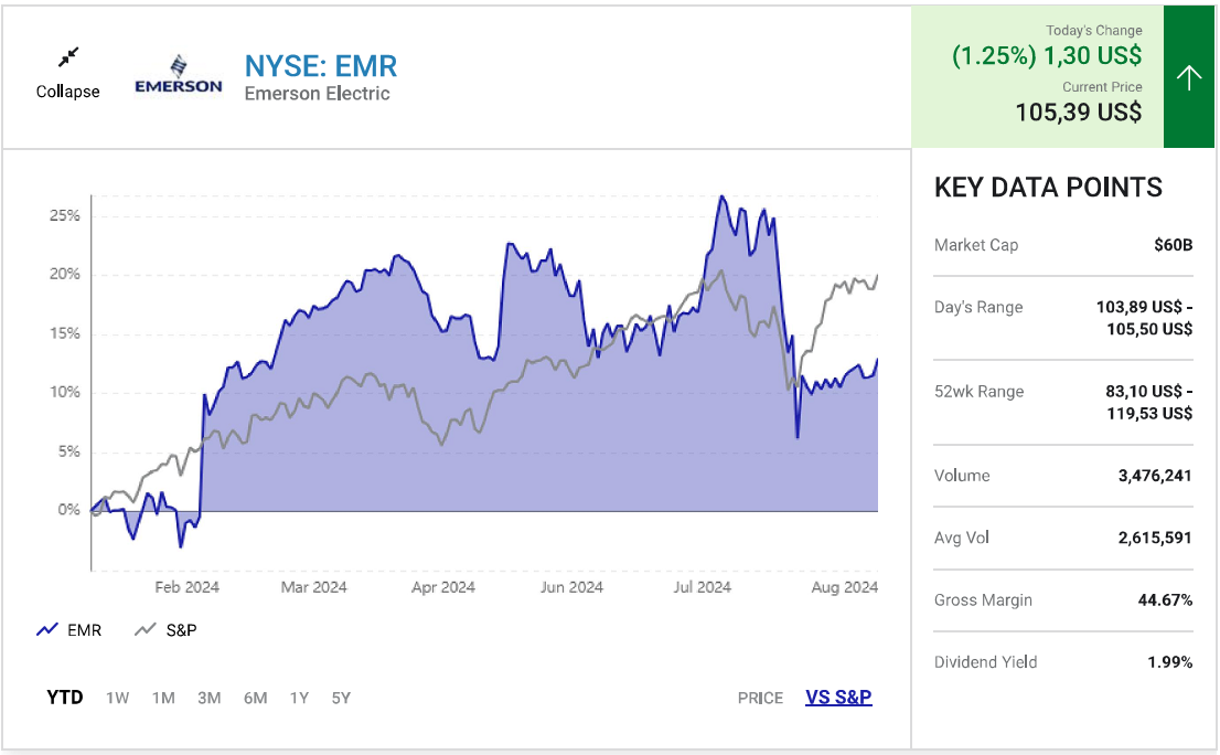 Xét về dài hạn, các giải pháp tự động hóa của Emerson đóng vai trò quan trọng trong việc duy trì hoạt động hiệu quả về mặt chi phí của khách hàng, một mối quan ngại thường trực đối với các nhà máy hoạt động bên ngoài các quốc gia có chi phí lao động thấp. Được giao dịch ở mức giá gấp 17,5 lần thu nhập dự phóng, cổ phiếu Emerson Electric có tiềm năng tăng giá rộng mở trong khi rủi ro giảm giá là rất hạn chế do các thị trường hoạt động của công ty đang chạm đáy trong năm 2024.