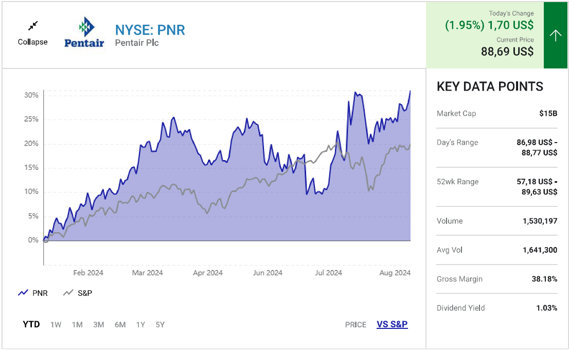 Pentair là công ty xử lý nước công nghiệp, thương mại và dân dụng. Đây là một trong những cổ phiếu hấp dẫn nhất trên thị trường hiện nay vì ba lý do sau: