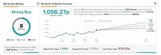 Các nhà phân tích tại Jefferies gần đây đã nâng giá mục tiêu cho cổ phiếu BAE, từ 1.000 GBX lên 1.060 GBX. Trên tổng thể, BAE được khuyến nghị mua mạnh với giá mục tiêu trong 12 tháng tới là 1.056 GBX.