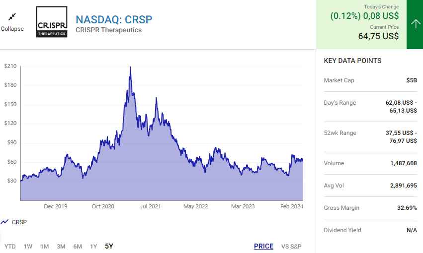 Cổ phiếu CRISPR Therapeutics hiện có giá khoảng 62 USD, giảm so với mức đỉnh đạt được vài năm trước.