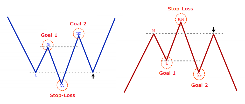 Tương tự, với một xu hướng giảm. Đầu tiên, chúng ta xác định đáy L, sau đó là đỉnh H của cú điều chỉnh giá, đáy thấp hơn LL và cuối cùng là đỉnh HH cao hơn. Điều này đồng nghĩa với việc cấu trúc của xu hướng giảm đã bị phá vỡ. Chúng ta chú ý đến tình huống này và chờ đợi một điểm entry có thể để mua.