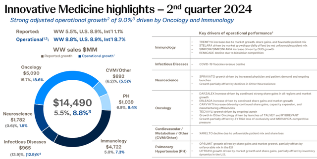 Sự tăng trưởng này chủ yếu đến từ phân khúc Y học Đổi mới, chiếm 65% doanh thu của JNJ trong quý II năm 2024. Trong khi phân khúc MedTech không đạt hiệu quả như mong đợi, phân khúc Y học Đổi mới đã chứng kiến sự gia tăng nhờ vào các lĩnh vực ung thư và miễn dịch học, mặc dù doanh thu từ thuốc chữa tăng huyết áp phổi và một số danh mục khác giảm.
