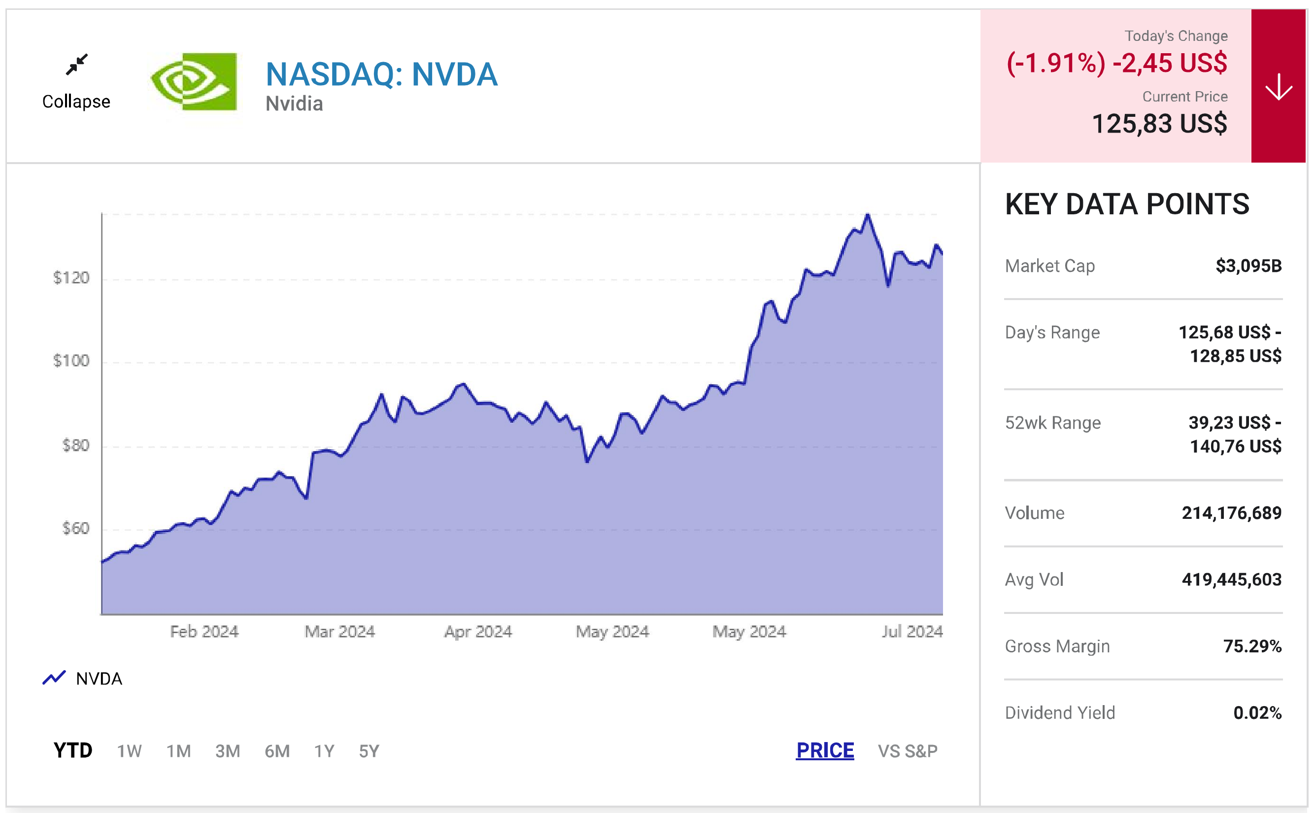Tuy nhiên, sự hoài nghi về “bong bóng” AI đã phần nào gây áp lực lên NVDA trong khoảng thời gian từ cuối tháng 6 và đầu tháng 7 và khiến cổ phiếu này giảm xuống mức thấp nhất là 118 USD/cổ phiếu sau khi đạt mức đỉnh 135 USD/cổ phiếu chỉ vài ngày trước đó. Tuy nhiên, NVDA đã phục hồi trở lại trong phiên giao dịch ngày 3 tháng 7 khi tăng 4%.