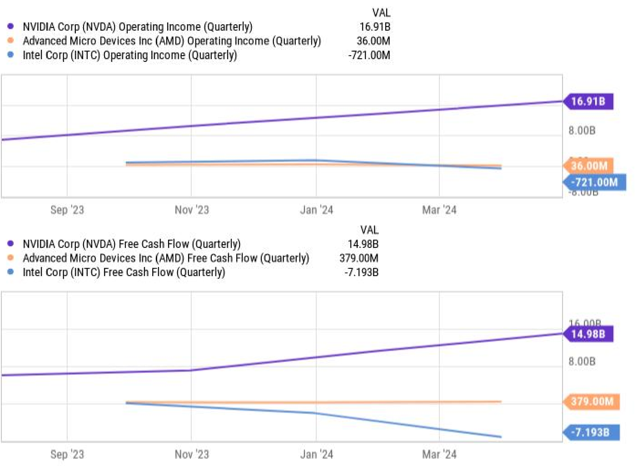 Dữ liệu trong bảng trên cho thấy ưu thế tài chính đáng kể của Nvidia so với các đối thủ cạnh tranh. Kể từ tháng 7 năm ngoái, thu nhập hoạt động và dòng tiền tự do của Nvidia đã tăng mạnh hơn nhiều so với AMD hay Intel, điều này mang lại cho Nvidia dòng tiền dồi dào để tiếp tục đầu tư vào hoạt động kinh doanh và duy trì sự thống trị thị trường. Bất chấp mức tăng trưởng trong thời gian gần đây, hệ số giá/thu nhập so với tăng trưởng (PEG) của Nvidia vẫn ở mức dưới 1, cho thấy cổ phiếu của hãng vẫn đang bị định giá thấp. Ngoài ra, với sự thống trị gần như tuyệt đối trong thị trường AI đang bùng nổ, Nivida rõ ràng là một cổ phiếu đáng mua trong tháng 7 này và là một cổ phiếu có thể giúp bạn trở thành triệu phú với giá trị đầu tư hợp lý.