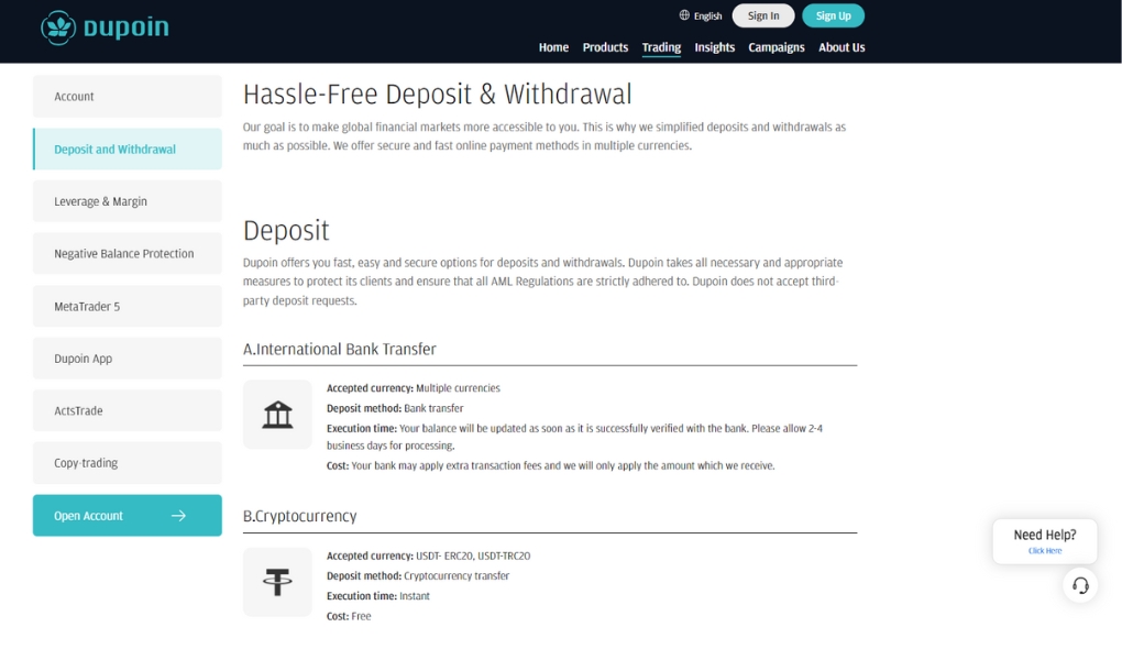 - Tốc độ nạp rút: Theo khảo sát mà chúng tôi có thực hiện thì các giao dịch nạp rút tại Dupoin được thực hiện khá nhanh, gần như ngay lập tức. Trong một số trường hợp đặc biệt, Dupoin sẽ cần tối đa 2-4 ngày làm việc để xử lý yêu cầu rút tiền của bạn. Các quy định nạp rút tiền đều được Dupoin quy định rõ tại website của sàn (https://www.dupoin.com/markets/trading/funds/).