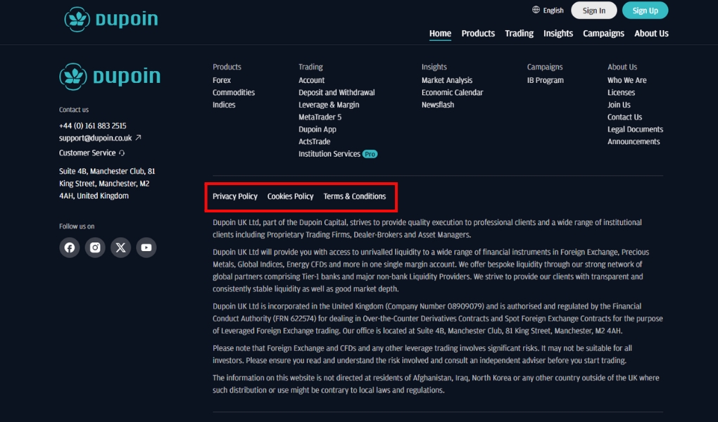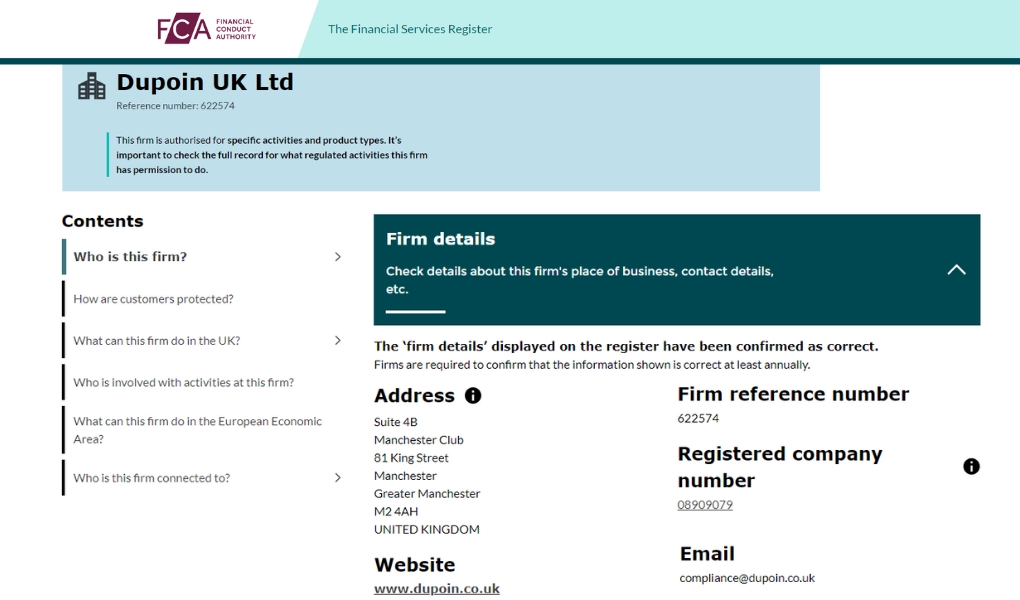 - Giấy phép FCA (FRN 622574) đứng tên Dupoin UK Ltd, được cấp bởi The Financial Services Register (Cơ quan Quản lý Tài chính Vương Quốc Anh).