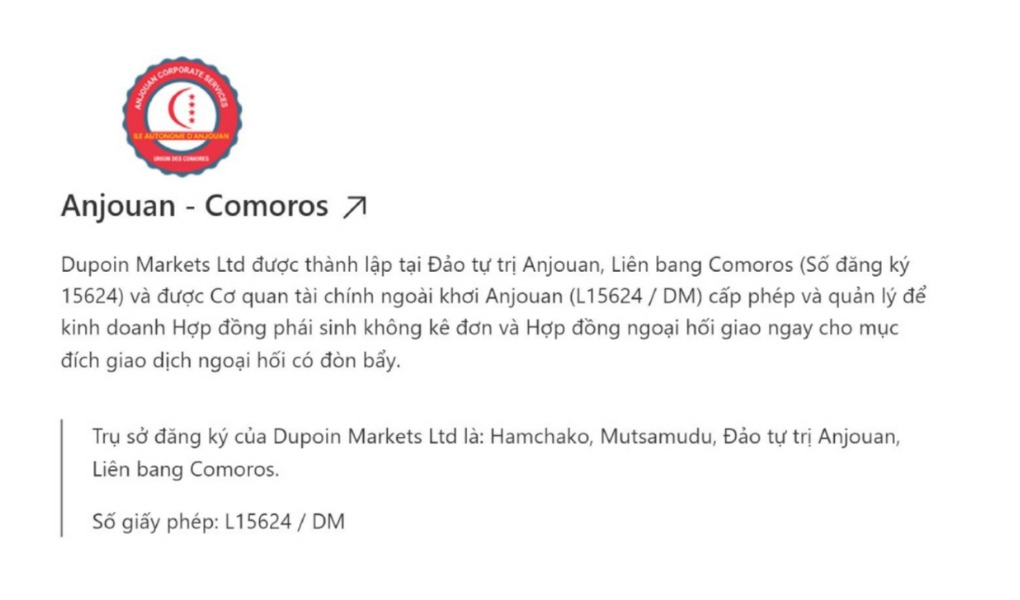 - Giấy phép AOFA (L15624/DM) đứng tên Dupoin UK Ltd, được cấp bởi The Anjouan Offshore Finance Authority (Cơ quan Quản lý Tài chính nước ngoài Anjouan).