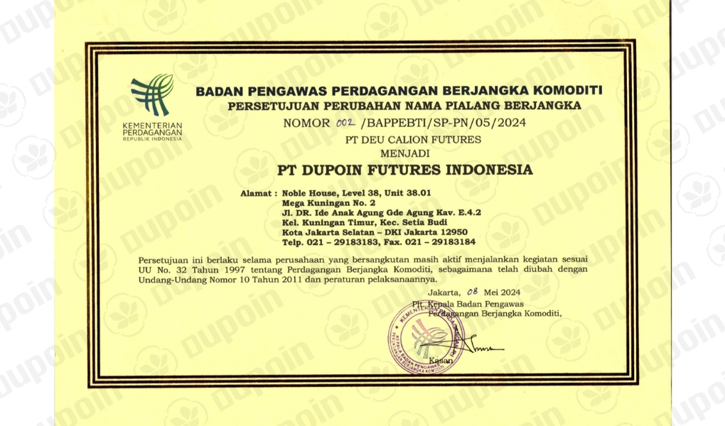 - BAPPEBTI (423/BAPPEBTI/SI/I/VII/2004) đứng tên PT Dupoin Future Indonesia, được cấp bởi Badan Pengawas Perdagangan Berjangka Komoditi (Cơ quan quản lý giao dịch hàng hóa tương lai Indonesia – BAPPEBTI).