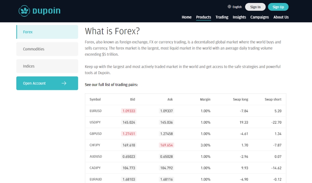 Dupoin có cung cấp cho nhà đầu tư một danh mục sản phẩm khá đa dạng. Cụ thể hơn, dưới đây chúng tôi sẽ review sàn Dupoin chi tiết về các sản phẩm và số lượng giao dịch::