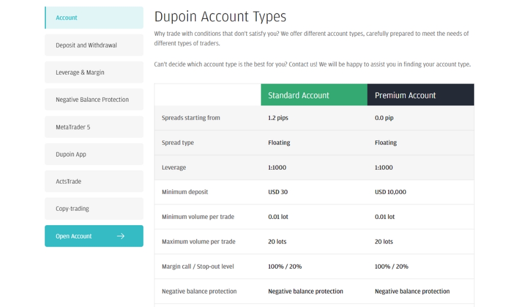 Sàn Dupoin hiện đang hỗ trợ nhà đầu tư giao dịch với 2 loại tài khoản chính, bao gồm tài khoản Standard và tài khoản Premium. Dưới đây chúng tôi có review sàn Dupoin chi tiết hơn về các loại tài khoản giao dịch để bạn đọc tham khảo dễ dàng hơn: