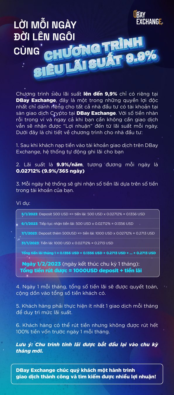 Sàn DBay Exchange là một sàn giao dịch luôn mong muốn mang lại trải nghiệm tốt nhất cho khách hàng của mình. Bằng cách thiết lập các chiến dịch khuyến mãi theo tháng cũng như cung cấp nhiều dịch vụ lãi suất, vay vốn hấp dẫn, DBay Exchange đã thu hút hơn 100,000 nhà đầu tư trong thời gian ngắn với những chiến dịch lớn như “Tận hưởng ưu đãi lãi suất đến 9.9%”, chương trình khuyến mãi tặng $200 khi mở tài khoản.