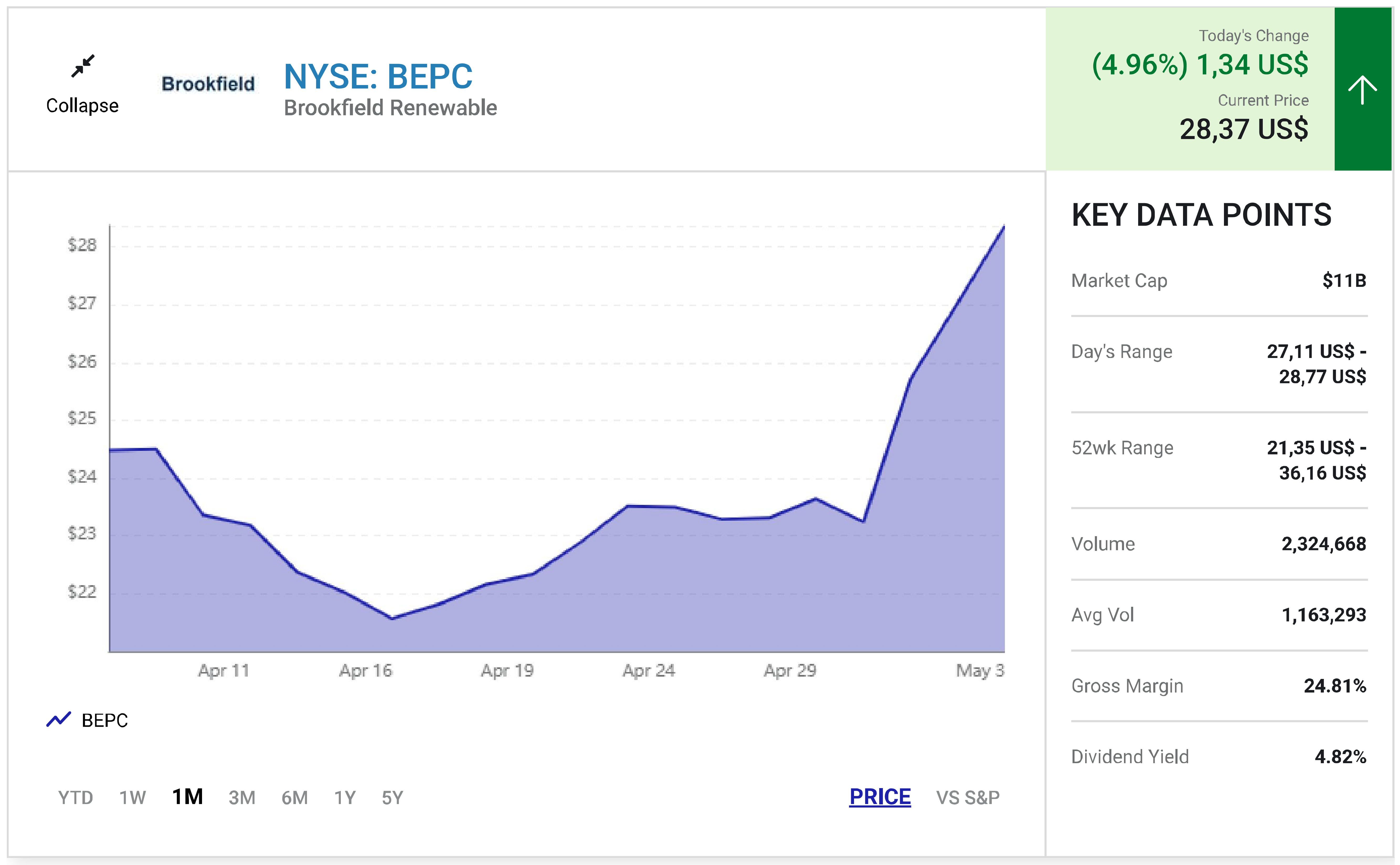 Tuy nhiên, không phải tất cả các cổ phiếu ngành năng lượng đều tăng giá. Enbridge (ENB) và Brookfield Renewable (BEPC) (BEP) là hai cổ phiếu ngoại lệ đi ngược với xu hướng tăng điểm chung của ngành. Nhưng sự giảm giá này lại là một trong nhiều lý do khiến chúng trở thành những khoản đầu tư hấp dẫn trong tháng 5 này.