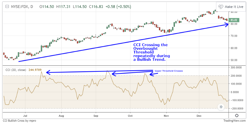 Trạng thái quá mua và quá bán cũng có thể được xem như một tín hiệu về độ mạnh khi sử dụng CCI. Xu hướng hiện tại có thể đang được tăng cường độ mạnh.