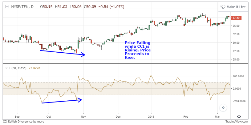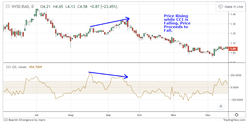 Xung lượng thường đi trước sự thay đổi về giá. Bởi vậy, với hầu hết các chỉ báo dao động dựa trên xung lượng, phân kỳ giữa giá và chỉ báo nên được chú ý. Chỉ số Kênh Hàng hóa cũng vậy. Phân kỳ giữa CCI và hành động giá có thể dự báo sự thay đổi xu hướng đang đến.