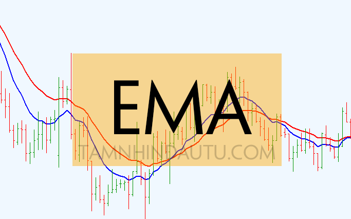 Biểu đồ dưới đây thể hiện đường nhanh EMA 5 ngày (màu hồng), đường vừa EMA 21 ngày (màu vàng) và đường chậm EMA 63 ngày (màu xanh).