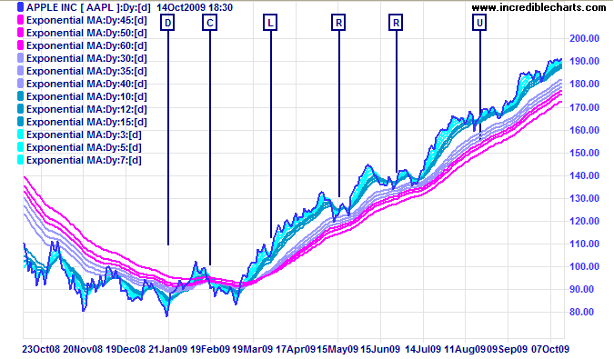 Chỉ báo Đa đường MA được phát minh bởi Daryl Guppy và bao gồm hai nhóm: 6 đường EMA ngắn hạn và 6 đường EMA dài hạn. Các đường ngắn hạn là 3, 5, 7, 10, 12 và 15 ngày, còn các đường dài hạn là 30, 35, 40, 45, 50 và 60 ngày, nhưng chúng có thể thay đổi tùy theo khung thời gian giao dịch. Nhóm ngắn hạn đại diện cho góc nhìn của trader về thị trường, còn nhóm dài hạn đại diện cho các nhà đầu tư.