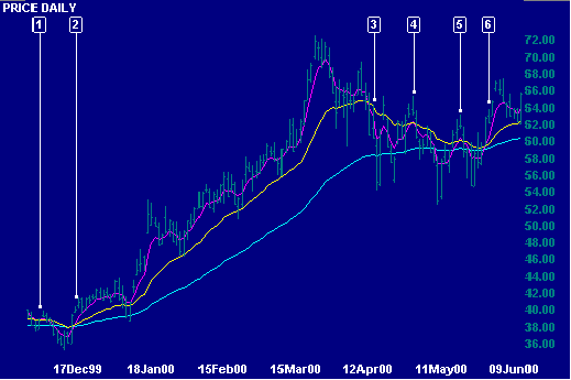 Hệ thống bao gồm 3 đường MA: nhanh, vừa và chậm. Điểm vào lệnh được xác định bởi đường vừa giao cắt với đường chậm, và điểm thoát lệnh được xác định bởi đường nhanh giao cắt với đường vừa.