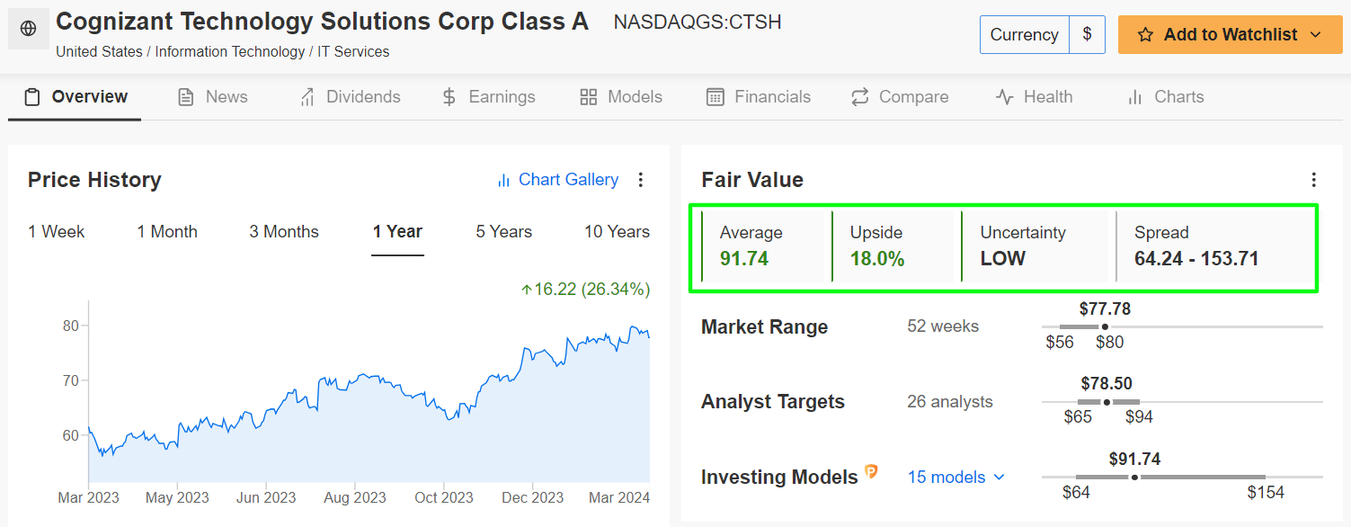 Không có gì ngạc nhiên khi Cognizant là một cổ phiếu được khuyến nghị mua mạnh khi các mô hình định lượng trong InvestingPro dự báo cổ phiếu CTSH sẽ tăng giá 18% trong 12 tháng tới.