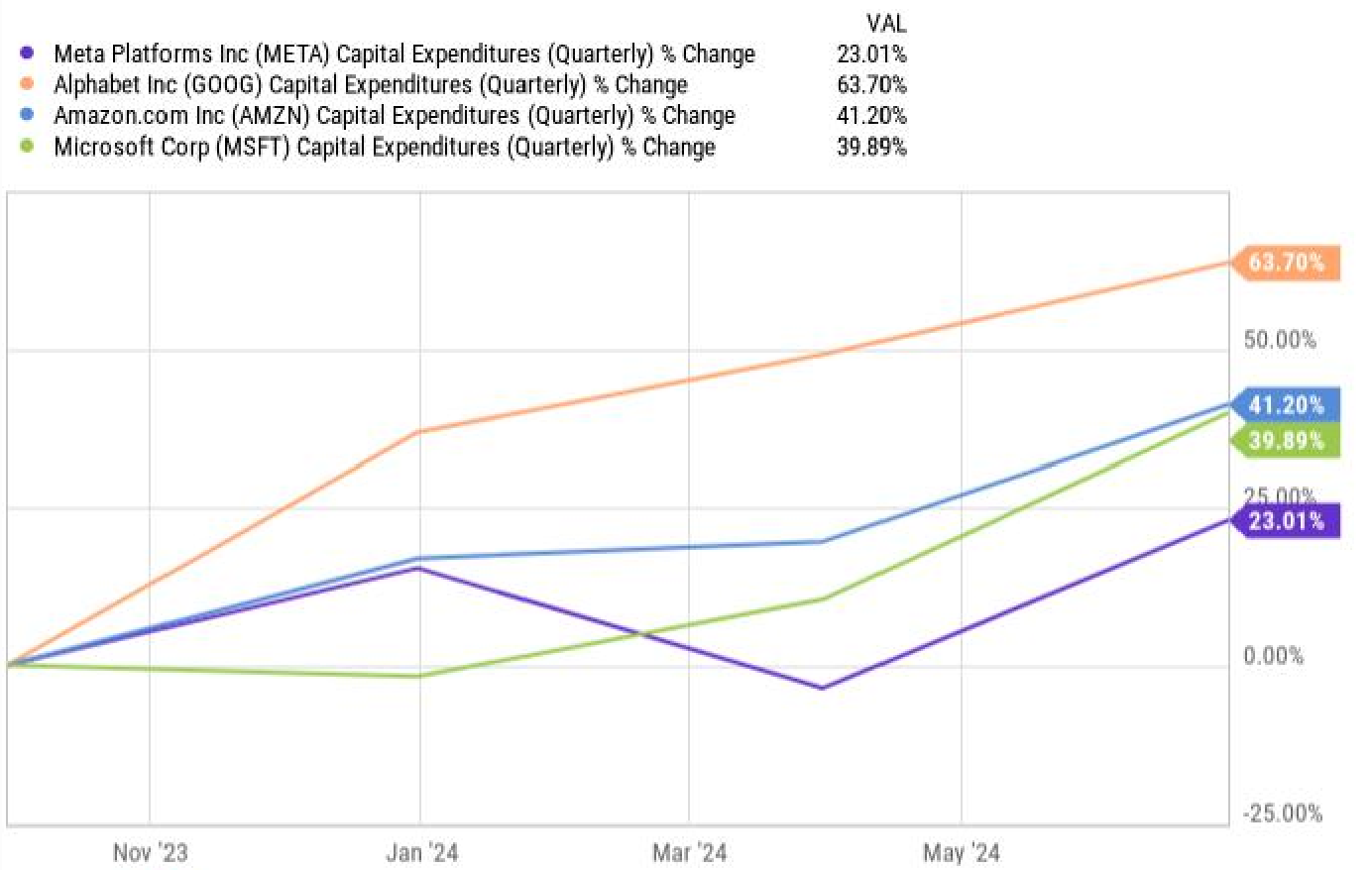 Trong đợt báo cáo thu nhập mới nhất, các CEO của Big tech – những công ty có nhu cầu lớn đối với chip của Nvidia đã trả lời các câu hỏi về kế hoạch chi tiêu vốn trong tương lai, đặc biệt là những khoản chi tiêu liên quan đến AI. Alphabet đã chi tiêu khoảng 32,3 tỷ USD vào năm 2023 và dự kiến sẽ nâng mức chi tiêu lên 50 tỷ USD trong năm nay. Alphabet không phải công ty duy nhất có kế hoạch tăng chi tiêu vốn lớn. Biểu đồ dưới đây minh họa mức thay đổi chi tiêu vốn của Alphabet và các công ty khác trong năm qua.