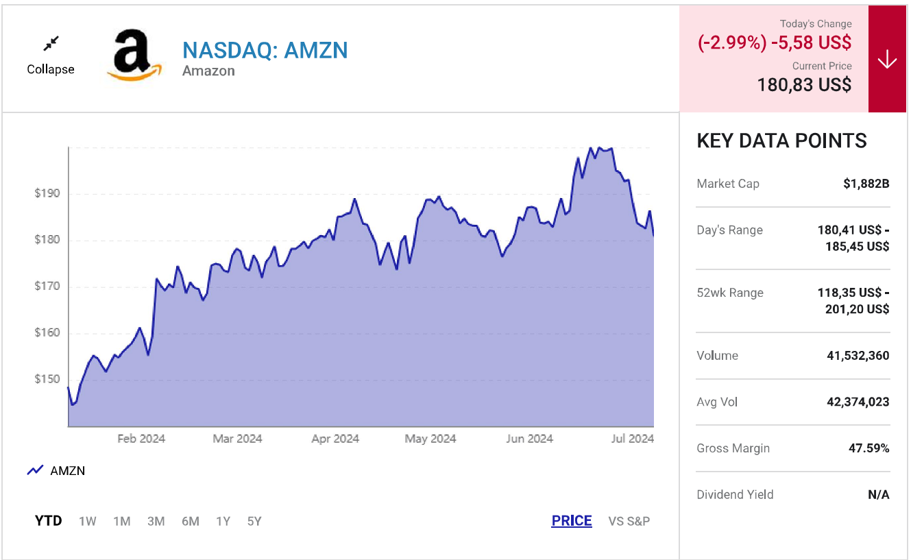 Amazon (AMZN) là công ty được hưởng lợi nhiều nhất từ đợt bùng nổ AI gần đây, với cổ phiếu của hãng tăng 119% kể từ đầu năm 2023. Nền tảng điện toán đám mây Amazon Web Services (AWS) đã giành được một vai trò quan trọng trong ngành khi trở thành lựa chọn hàng đầu của nhiều doanh nghiệp có nhu cầu tích hợp AI vào quy trình làm việc hàng ngày.