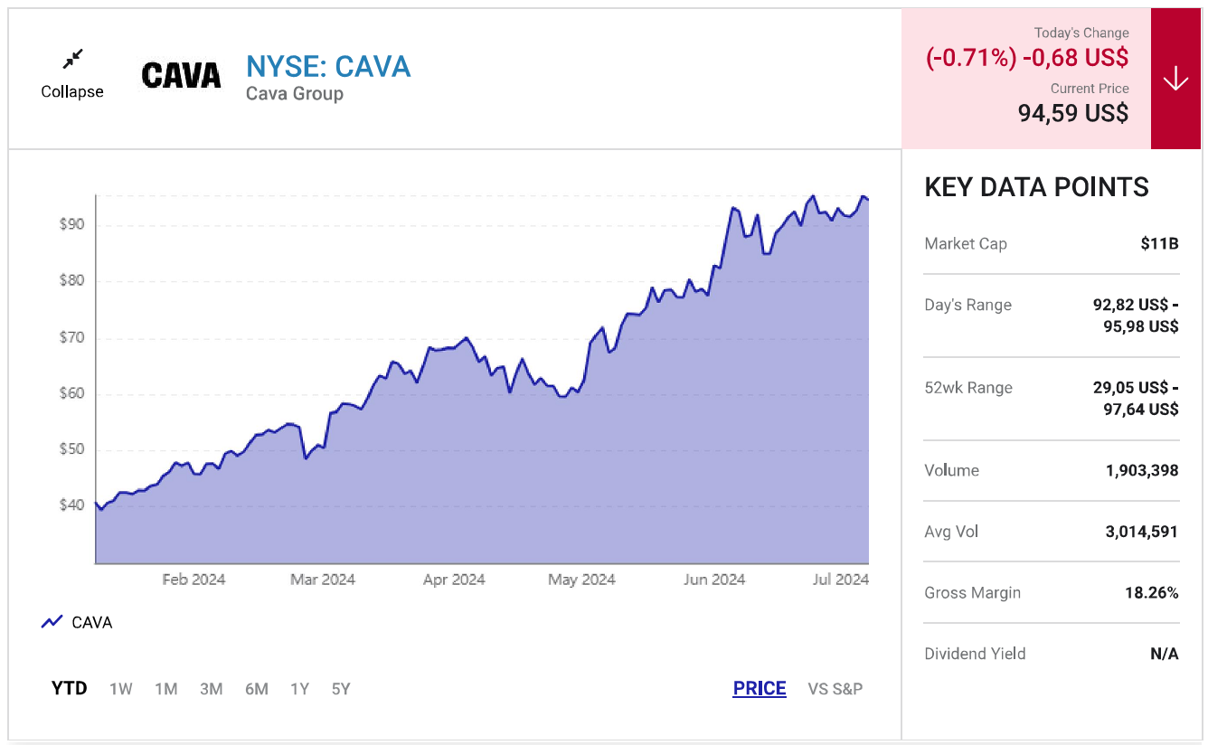 Các nhà đầu tư thường có xu hướng tránh xa các cổ phiếu mới trải qua IPO nhưng Cava đã được chứng minh một điều ngược lại. Cổ phiếu của chuỗi nhà hàng ăn nhanh bình dân Địa Trung Hải được niêm yết lên sàn chứng khoán với giá 22 USD vào mùa xuân năm ngoái. Cava đã tăng gần gấp đôi giá trị lên 42,98 USD vào cuối năm 2023. Cổ phiếu đã tiếp tục tăng gấp đôi một lần nữa trong năm nay để gấp bốn lần giá trị trong vòng chưa đầy 13 tháng kể từ IPO (phát hành cổ phiếu lần đầu ra công chúng).