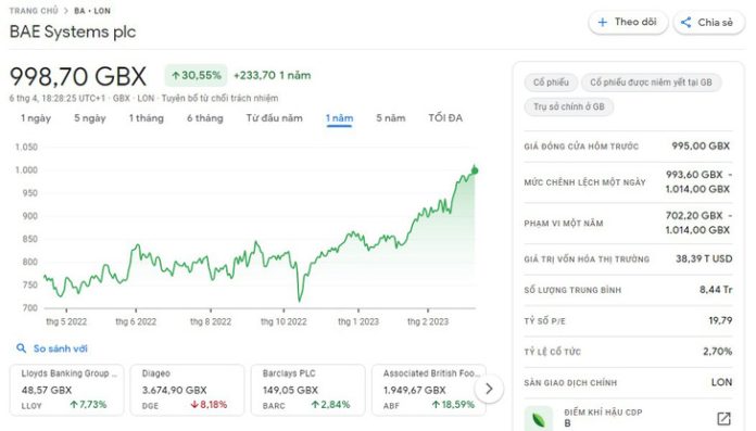 BAE Systems có giá trị vốn hóa thị trường 38,39 tỉ USD. Cổ phiếu của tập đoàn này đã tăng khoảng 30,55% trong 12 tháng qua nhờ lượng đơn đặt hàng mới đạt mức kỷ lục vào năm 2022, giao dịch ở mức 998,70 GBX (chốt phiên giao dịch ngày 6-4).