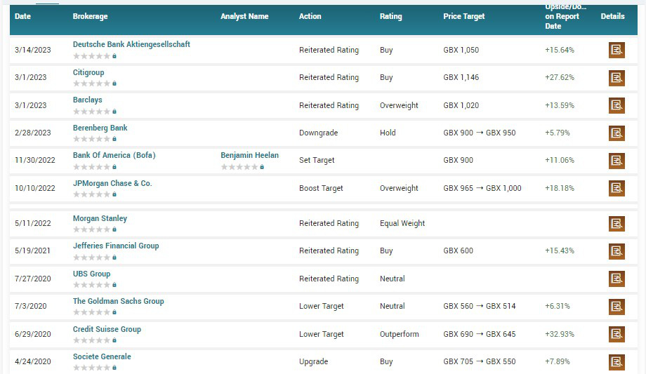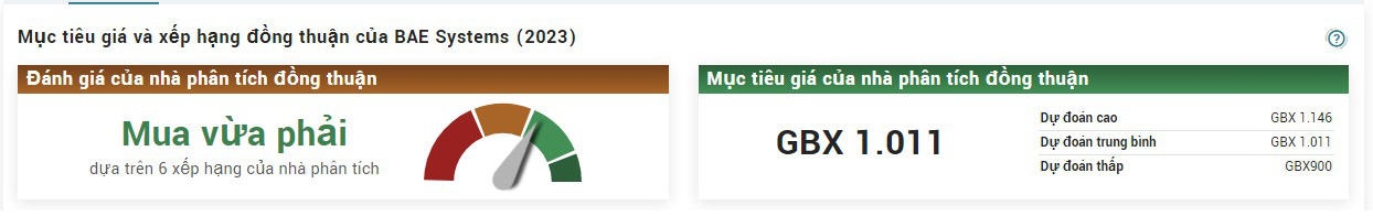 Theo marketbeat.com, cổ phiếu BAE Systems đang nhận được xếp hạng đồng thuận là “Mua vừa phải” từ 6 nhà phân tích. Cụ thể, 4 nhà phân tích khuyến nghị “mua”, 2 nhà phân tích khuyến nghị “nắm giữ”. Dự đoán giá trung bình trong 12 tháng cho cổ phiếu này là 1.011 GBX, tăng 14,57% (dựa trên mục tiêu giá 12 tháng).