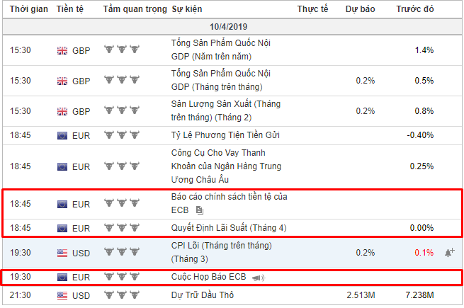 Lý do duy nhất khiến Euro tăng là do đồng USD yếu đi. Vào cuộc họp ECB trước, Mario Draghi khiến giá tăng từ 1,1176 lên 1,13 khi ông trao đổi về khả năng nới lỏng chính sách do tăng trưởng toàn cầu giảm và các mối đe doạ tiềm ẩn. Không có gì thay đổi kể từ khi đó đến nay và dự kiến sẽ là giọng điệu ôn hòa hơn nữa với tình hình hiện nay.