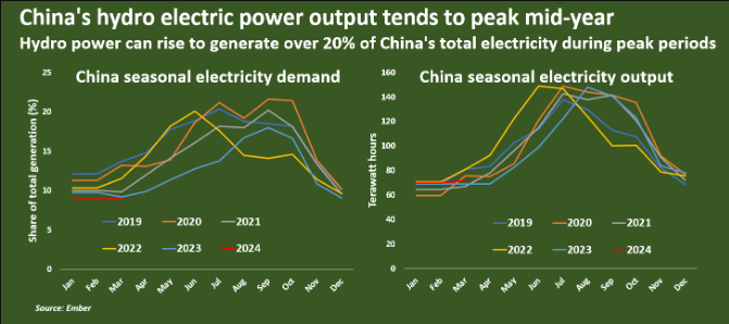 Theo dữ liệu từ tổ chức tư vấn Ember, thủy điện chỉ chiếm 9% tổng sản lượng điện của Trung Quốc trong quý 1 năm 2024, giảm so với mức trung bình 5 năm là 11% trong cùng kỳ.